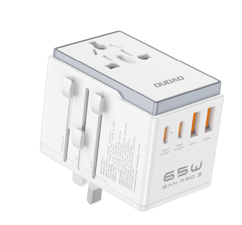 Adapter Dudao A65Pro 65W 2x Type-C / 2x USB (valge) on ideaalne lahendus igapäevaseks seadmete laadimiseks. Selle 65W võimsus tagab kiire ja efektiivse laadimise. Töötades kaht TYPE-C liidest ja kahte USB-porti, sobib see mugavalt erinevatele seadmetele. Valge värv ja kompaktne disain teevad sellest suurepärase kaaslase igasugustes olukordades.